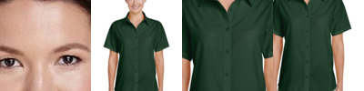 4.5 oz./yd²/150 gsm (US), 7.5 oz./L yd (CA), 100% polyester Snag and soil protect pique Moisture-management Anti-microbial Matching knit collar Three-button placket UPF 15-39