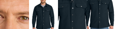 Built to layer over hoodies or tees, this tough, water-resistant shirt jac delivers a clean look both on and offsite. 100% polyester with water-resistant finish 100% polyester fleece lining Fabric waterproof rating: 1000MM Fabric breathability rating: 1000G/M2 Triple-needle stitching Full snap closure Two chest pockets with flaps and snap closures Reinforced open front pockets Adjustable snap cuffs Side vents